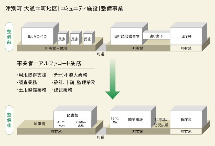 8年間にも及ぶ長大な時間と労力を費やして実現された今回のプロジェクトは、2014年に国の内閣府が創設した「地方創生事業」と「デジタル田園都市構想」に対する交付金の制度が設けられたことに始まります。津別町では、これらの交付金を積極的に活用することで長年にわたり住民から要望されてきた図書館の整備に加えドラッグストアの誘致やスーパーの再整備を目指します。さらに、防災やまちづくり・交流のための拠点づくりを目的とした「まちなか再生事業」として推進するためにデベロッパーとして豊富な実績を持つアルファコートとタッグを組み、官民協働での整備を進めてきました。