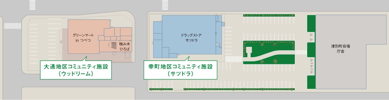 大通に面した「ウッドリーム」と幸町館のドラッグストアは、役場庁舎や「さんさん館」などの公共施設の間にあり、津別病院や金融機関などと並んで津別町の中心部となることから、交通量の多い国道240号から伺場までが一目で見渡せるよう連続の建物を配置しました。また「ウッドリーム」内のまちなかテラスと連動して、通路を挟んだバスターミナルと駐車場のスペースは、イベント開催時には会場としても利用できるよう「イベント広場」となります。もちろん、通常時は来館者の駐車場として利用されます。